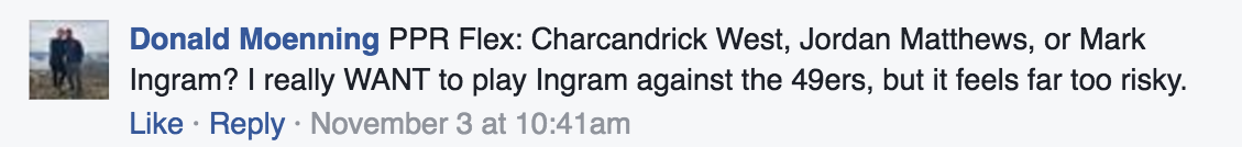 As I mentioned before, SF is an absolute mess. On top of that, Reggie is now playing in one of the best defensive divisions in football. If they’re forced to play catch-up with that horrible defense, Reggie should get the ball more than Hyde.